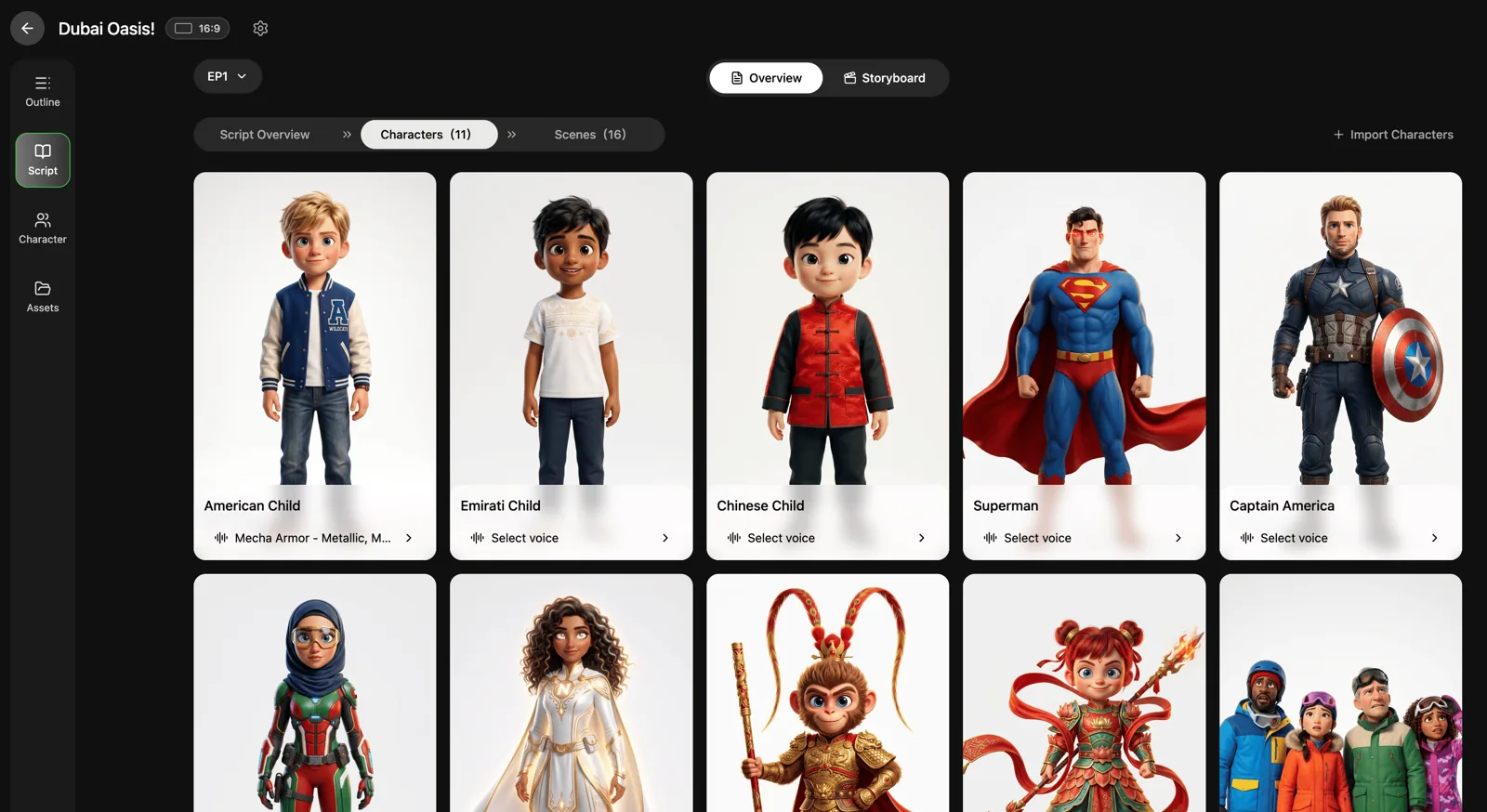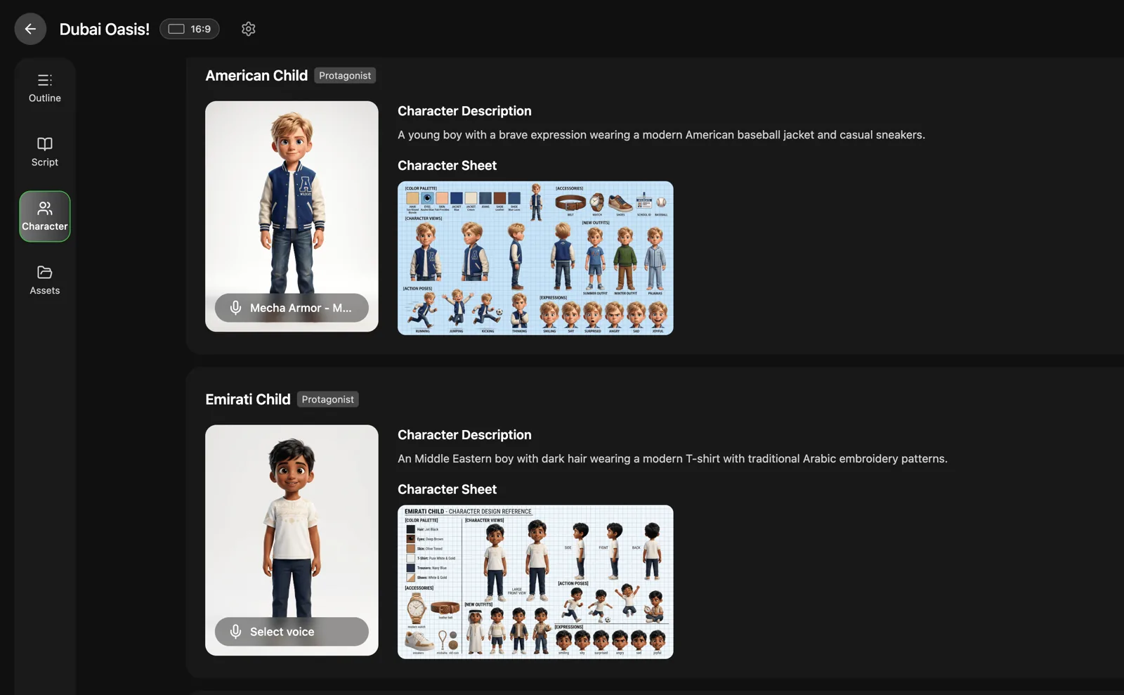 Start from story role and signature traits. Build a reference sheet that can hold up across angles and emotions. Then carry that character into storyboard and scene generation instead of rebuilding prompts from scratch.